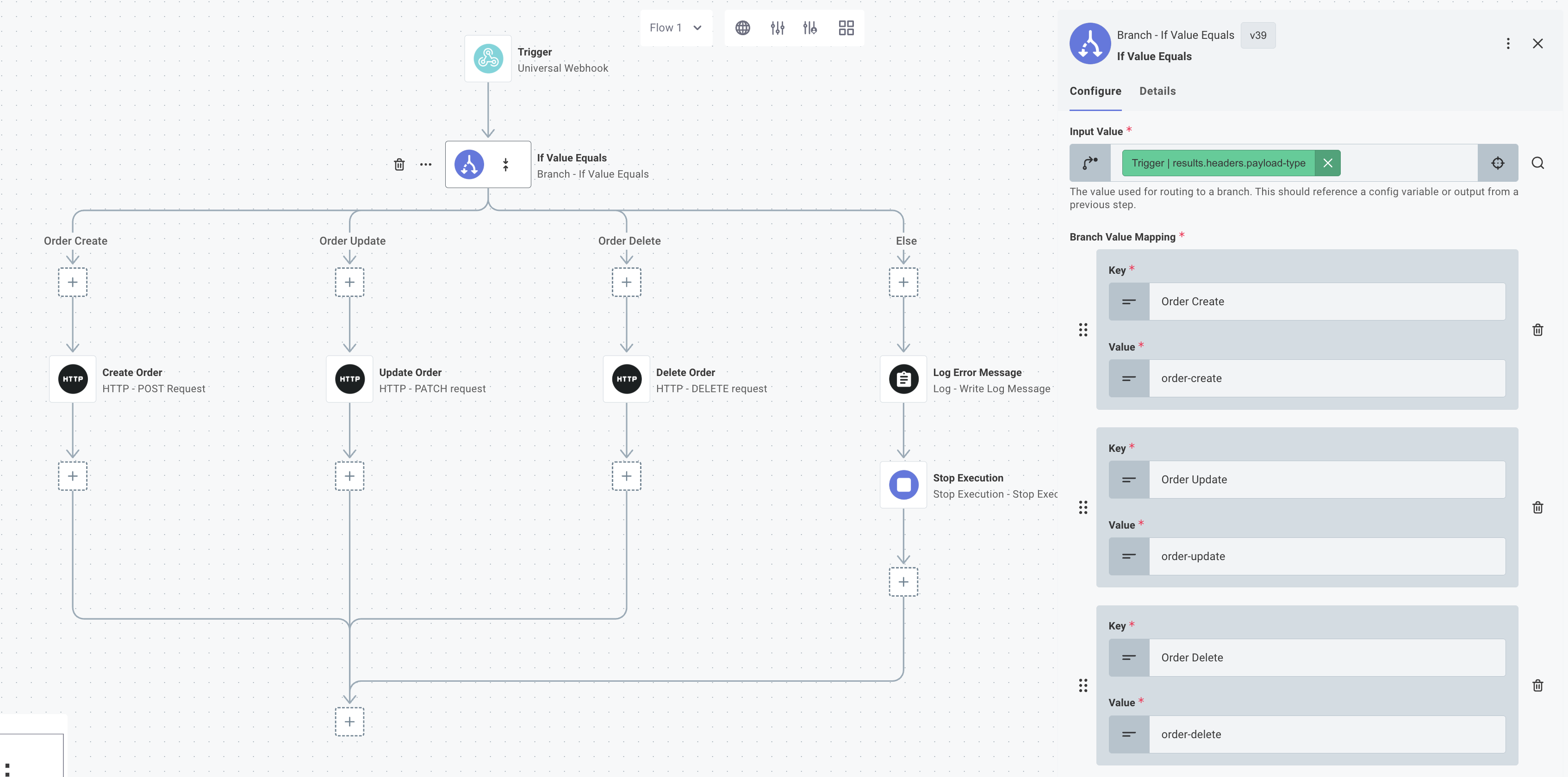 For example, if you received a webhook request that includes an order-create, order-update or order-delete event, you could structure your branches like this: