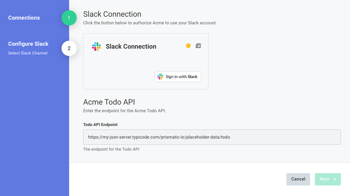 "<h2>Slack Connection</h2><p>Click the button below to authorize Acme to use your Slack account.</p>",